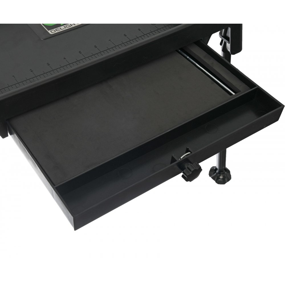 Carp Pro Delight Bivvy Table With a Rig Box – складаний багатофункціональний монтажний стіл, розроблений спеціально для коропової риболовлі. Монтажний Carp Pro Delight Bivvy Table With a Rig Box призначено для підготовки снастей, виготовлення монтажів та оснасток під час риболовлі. Стільницю з високоміцного пластику розділено на 6 відділень із високими бортами, що забезпечує зручність і максимальну ефективність: кожен предмет лежить на своєму місці і не скочується зі стола. На поверхню основного відділення нанесено лінійку для вимірювання довжини оснасток із шкалою в сантиметрах та дюймах. Чотири регульовані за висотою ніжки мають телескопічну конструкцію та оснащені грязьовими п'ятами на шарнірах, що дає змогу встановити стіл практично на будь-якому рельєфі та м'якому ґрунті. Під стільницею розташовано висувну полицю, що має відсік для інструментів і велику зручну повідочницю із знімним елементом ЕВА. Полиця від самовідкривання фіксується спеціальною защібкою. За необхідності повідочницю взагалі можна прибрати і користуватися самою полицею. Каркас столу виготовлено з легкого та міцного пластику, що значно зменшує вагу Delight Bivvy Table With a Rig Box, а його складана конструкція забезпечує максимальну зручність під час зберігання і транспортування.