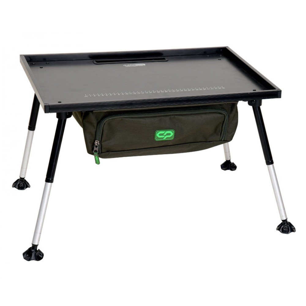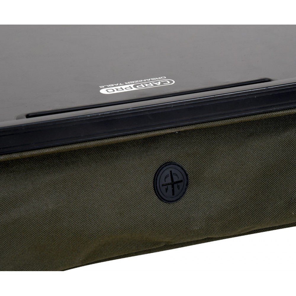 Монтажний стіл Carp Pro Organizer Table – складаний монтажний стіл-органайзер, який призначено для виготовлення монтажів і оснасток під час риболовлі, підготовлення снастей і розміщення гаджетів. Краї металевої стільниці обладнано збільшеними бортиками, що запобігають падінню предметів зі столу. Крім того, стільниця Carp Pro Organizer Table має слот для вертикального або горизонтального встановлення телефона та лінійку від 0 до 35 см для вимірювання довжини повідців. Чотири складані регульовані за висотою ніжки мають телескопічну конструкцію і оснащені грязьовими п'ятами на шарнірах, що дає змогу встановити стіл практично на будь-якому рельєфі берега та м'якому ґрунті. Під стільницею розміщено сумку зі зносостійкого матеріалу 600D розміром 38х36х12 см із блискавкою в передній частині. У задній частині сумки передбачено отвір для виведення проводів і зарядних кабелів для гаджетів. Компактна складана конструкція столу Carp Pro Organizer Table забезпечує максимальну зручність під час транспортування.
